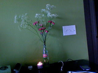 It may come as a shock, but I actually like Valentine's Day. There aren't a lot of things I get "girly" about, but I do enjoy receiving flowers and chocolates. At the moment, I have a wonderful bouquet of red carnations and baby's breath sitting on my desk. I bought them myself at the store since my boyfriend is too lazy to wrestle with the florist shop this late in the season. As you can see, I like to recycle soda bottles. But my desk is clean...for once.