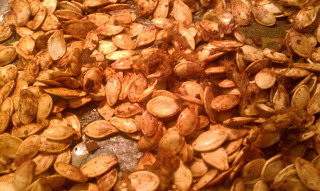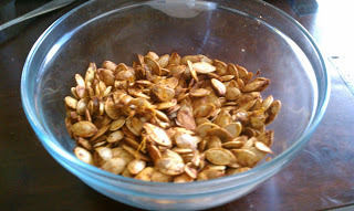 Line your baking sheet with wax paper. Preheat the oven to 325 degrees F. Melt your butter with the chopped garlic and or additional seasonings in the microwave and then pour over the seeds on the baking sheet. Roast the raw seeds and butter mixture for 45 minutes, stirring every 15min or so. Done.