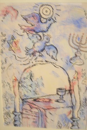 The table could be an altar, the circular lines above the table could indicate the traditional canopy for a Jewish wedding. Certainly the menorah and the star of David suggest a Hebraic tradition.