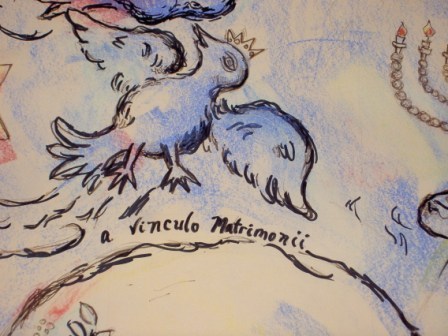 The Chagall we’ve been working with had similar details to this real one. Closer examination showed pencil markings on the paper used by whomever painted it. We were curious from the start, however, by those words painted in the middle: vinculo matrimonii.