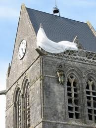 He took us to his home first, across the street from the infamous church at Sainte-Mère-Église, where the Red Buttons character hung from a parachute for several hours during the invasion while a fire fight went on in the courtyard. He survived by playing dead. The church has never forgotten him, and a dummy parachutist resides on the steeple to this day.
