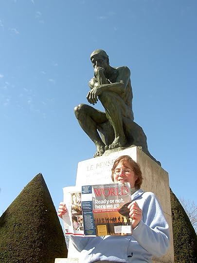 We're also missing the picture of me looking through the magazine on top of Notre Dame, nor do we have a picture of me with it at Loch Ness. We took a picture of me at the Louve showing recent events to a statue of Sargon. I wonder if that photo is in my son's camera?