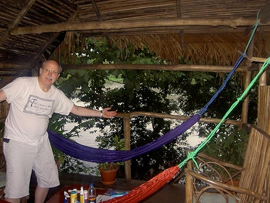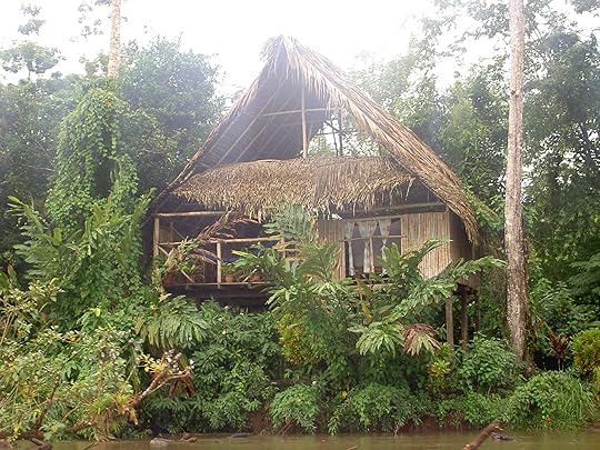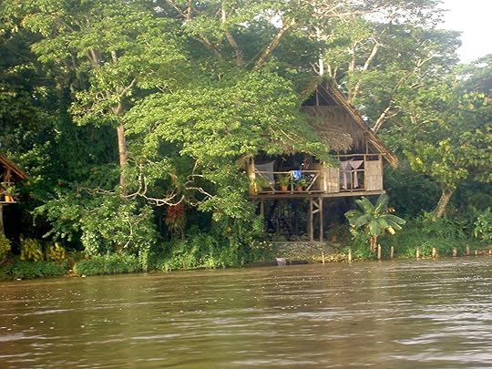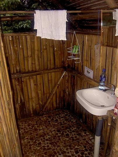 This tree house even came with a bathroom, replete with cold shower and a flush toilet. Who could complain about that? One afternoon a yellow frog with dark green eyes poked his head through the thatch and watched me shiver. Even now I'm not sure if it was the water or the reptilian eye that caused me to hurry out. It was fun to look past the shower head and watch a monkey swing past.