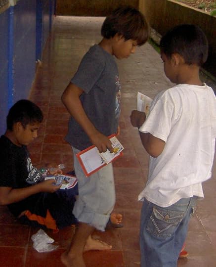 Even the boys paused in playing with their bouncy balls to look through the booklet. As we walked back to the boat in Sabalos, we saw children all over the streets with Bible booklets, some reading, some just sifting through to look at the pictures.