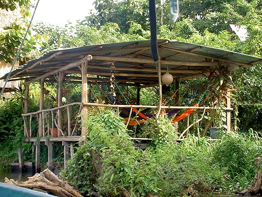 The tall roof overhead kept out the monsoon rains that poured down in the evenings. Down near the boat dock, a shelter housed six hammocks where we could gather at dusk and watch the birds fly to roost on an island in the middle of the river. One of the few electrical outlets where you can charge your I-pod or camera battery was in the shelter. Or in the dining area, equally open to the elements.
