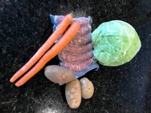 Sausage meal, ready to cook!We gather and eat a traditional meal: Slovenian sausage, potatoes, cabbage, carrots, and bread.