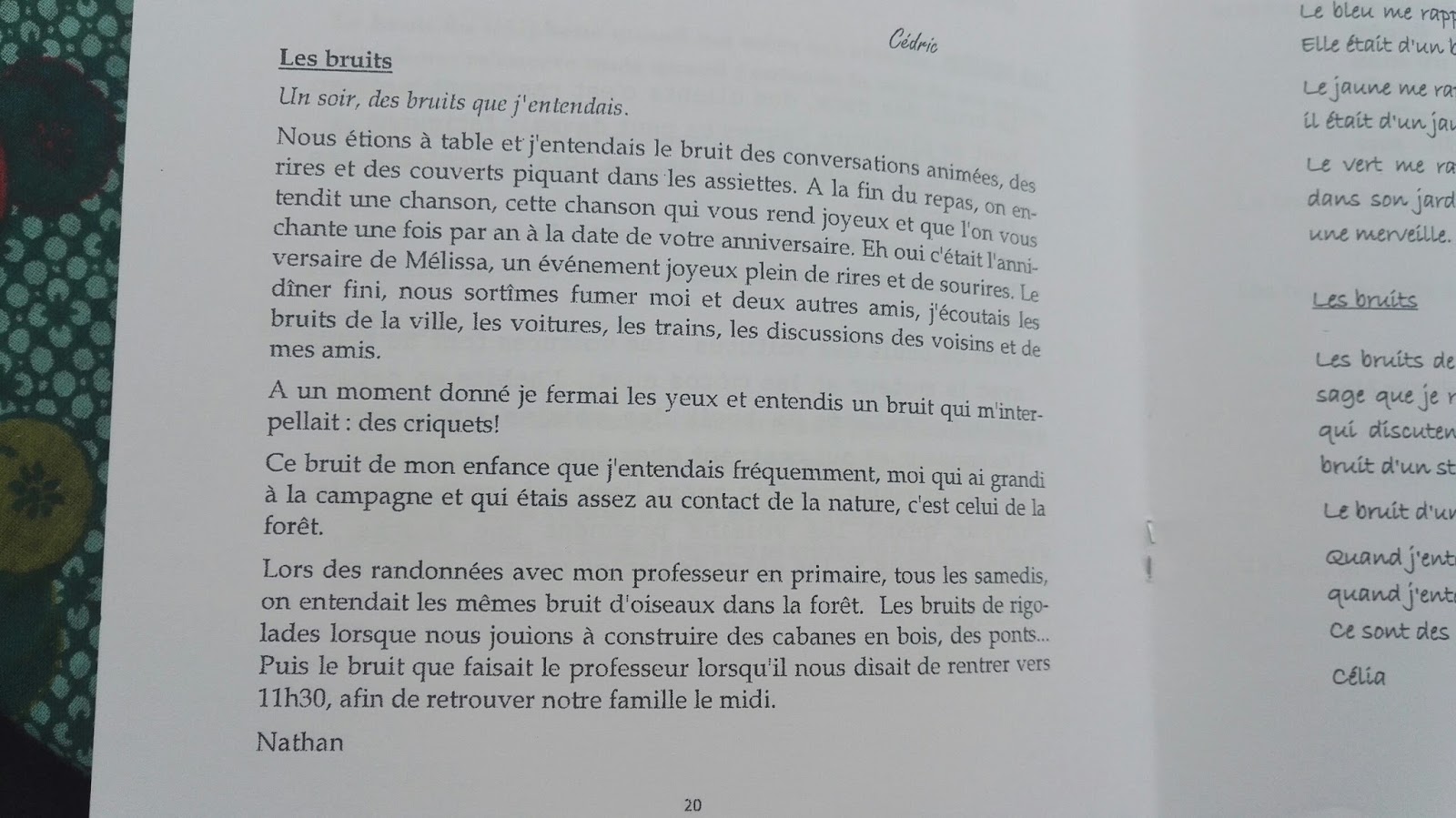 Ils ont écrit des Rien qu'une fois (Winioux), des planches de BD inspirées de Nestor, maudits mercredis (Didier), des je me souviens, des textes sur les couleurs, sur les bruits (ateliers inspirés par Les Bruits chez qui j'habite, l'édune) ... et des bios menteuses.