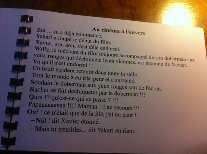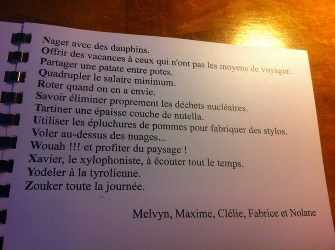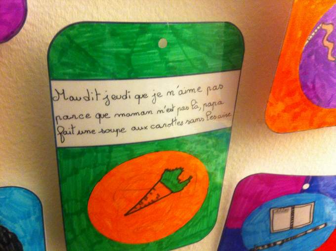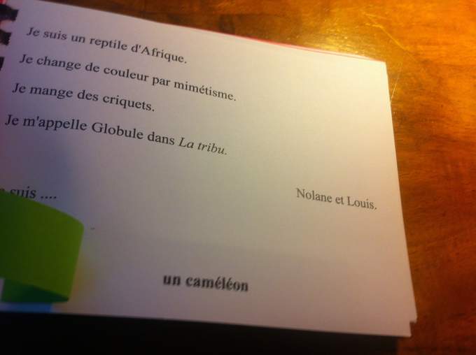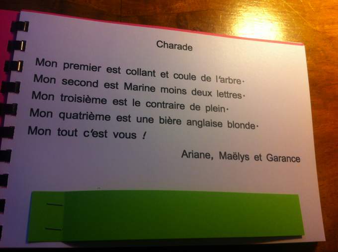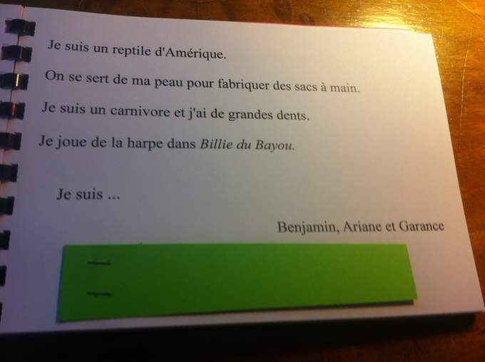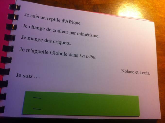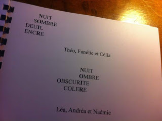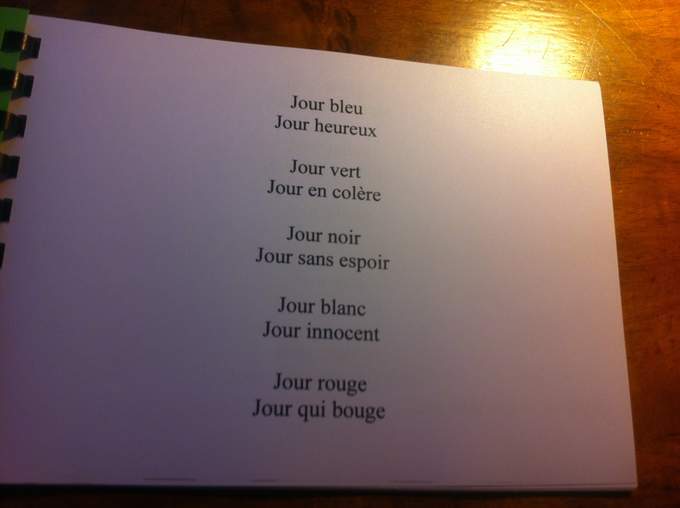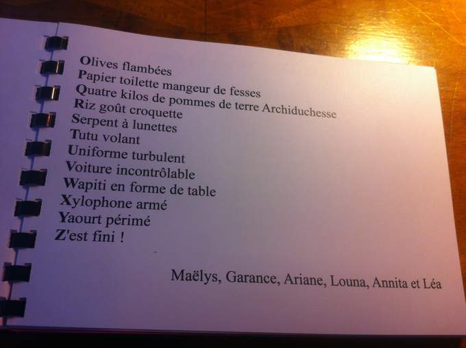 Et un travail incroyable au collège de Vernoux en Vivarais, dont les élèves m'ont offert deux livrets formidables réalisés en atelier d'écriture avec Mme Dessemon-Michon. GENIAL !! Des rébus, des devinettes, des recherches poétiques autour de Mon secret rit tout le temps (Kilowatt), des couleurs et des jours de la semaine, et des créations oulipiennes autour de l'alphabet.