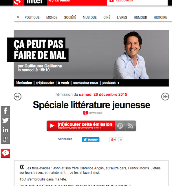 Au moment où il est sélectionné à un 13ème prix (!), mon roman La Drôle d'évasion sera mis en avant dans l'émission "spéciale littérature jeunesse" de Guillaume Gallienne sur France Inter : "ça peut pas faire de mal".
