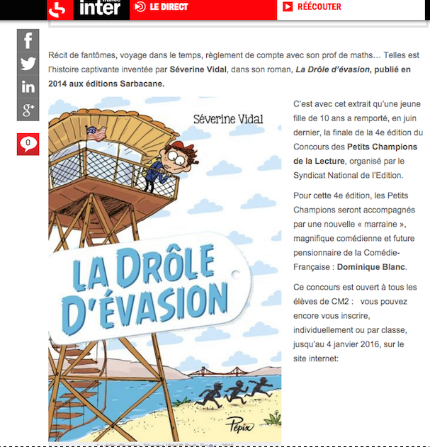 N'oubliez pas que le 26 décembre à 18h10, l'émission de Guillaume Gallienne, ça peut pas faire de mal sur France inter sera consacrée à la littérature jeunesse et s'ouvrira sur un extrait de "La Drôle d'évasion" lu par Eve (la gagnante des Petits Champions de la lecture).