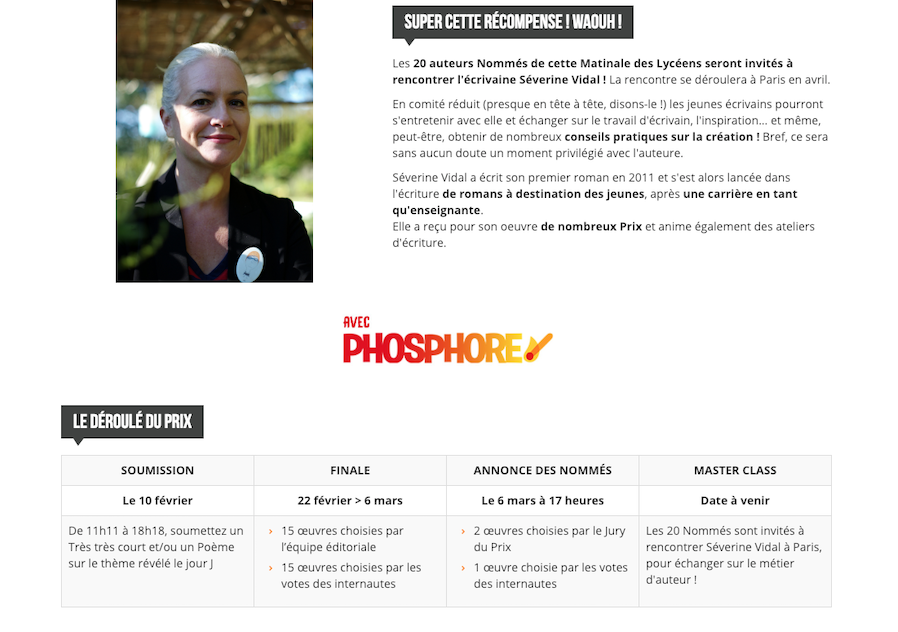 Le magazine Phosphore organise un prix très original : le 10 février, les lycéens entre 14 et 19 ans ont entre 11h11 et 18h18 pour écrire un poème ou un très court texte sur un thème donné.