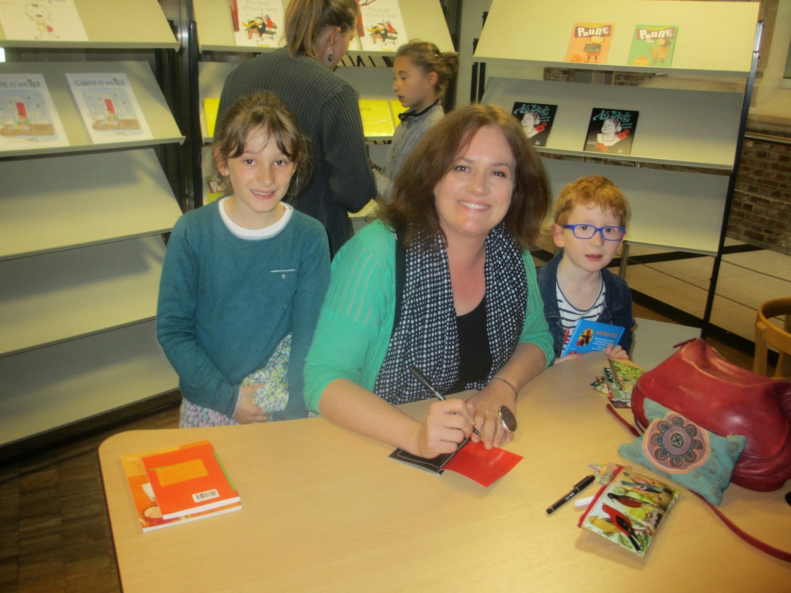 séance de dédicace à la médiathèque-école (les deux bâtiments sont imbriqués) :