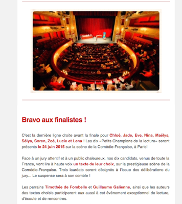 Eve, finaliste des Petits Champions de la lecture, a choisi de lire (lors de la finale) un extrait de La Drôle d'évasion (Sarbacane) !Ce sera le 24 juin à la Comédie Française, en présence des auteurs des livres choisis.