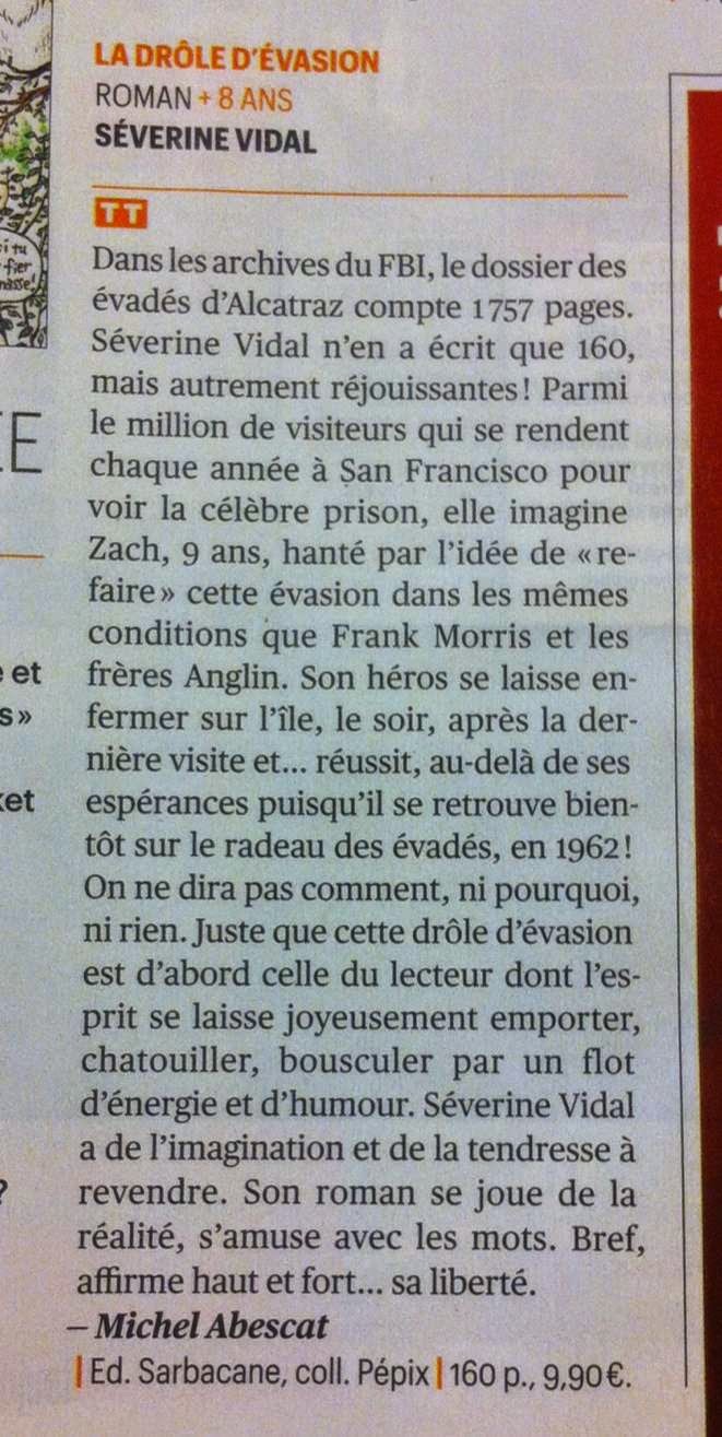 "...cette drôle d'évasion est d'abord celle du lecteur dont l'esprit se laisse joyeusement déborder par un flot d'énergie et d'humour. Séverine Vidal a de l'imagination et de la tendresse à revendre."
