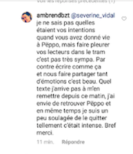 "Séverine Vidal est de retour avec un roman magique, sincère, émouvant, drôle… Bref, c’est un nouveau coup de cœur pour cette autrice! Mon dernier était pour le magnifique Quelqu’un qu’on aime , que je ne cesse de recommander! Il faudra compter désormais avec Pëppo ! Séverine Vidal insuffle une vitalité, une énergie, une sincérité dans ses personnages qu’on a l’impression d’être à leurs côtés le long du fragment de vie qu’elle nous conte."