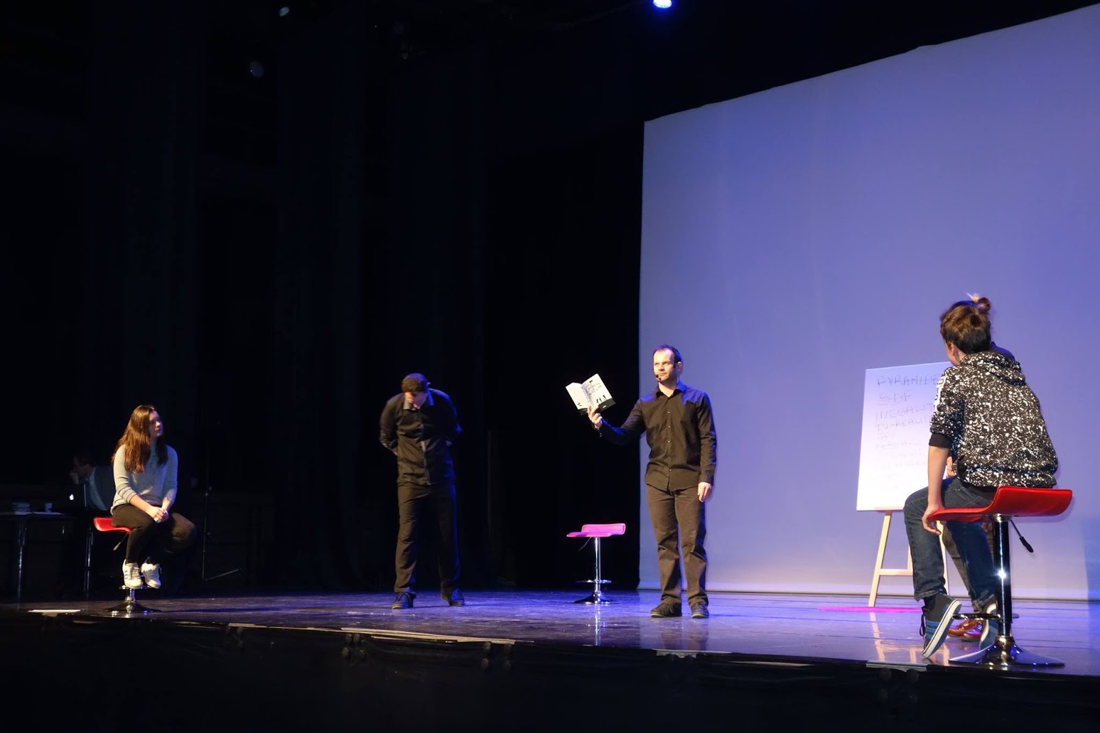 Vous trouverez ci-dessous des auteurs dont une Caroline Solé en pull d'hiver (lisez sa Pyramide des besoins humains ), une Marion Brunet en dédicace (lisez son "Dans le désordre !"), une Muriel Zürcher (lisez son Robin des Graffs !), un Xavier-Laurent Petit (lisez son "La vie Sauvage" !), et ma petite bande, Rachel Corenblit (mon panda, lisez "Que du bonheur !"), Alice de Poncheville (foncez sur "Nous, les enfants sauvages" !) et Eric Senabre (lisez Le Dernier songe de Lord Scriven !). Vous trouverez des enfants qui lisent, qui dessinent des couvertures au tableau, une fille déguisée en Caleb McKenzie-Mouchon (le père de Zach dans La drôle d'évasion), des jeux autour des livres dans le cadre du Prix Sésame, une foule qui connaît 5 livres par coeur, un Laurent Blin maître de cérémonie, un peu du collège Lis Isclo d'Or de Pierrelatte, une Claire Cantais qui imite très bien l'escargot, et un Mickaël El Fathi aux yeux rouges.
