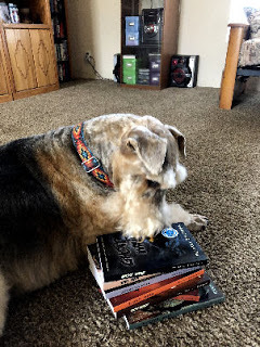 All my books, as always, are Annie-approved. Below, she's saying, "What's that blue thing? Oh, it's an award! Cool!" (She would have thought it was cooler if it was something to eat.)