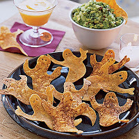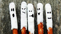 Stuffed potato ghosts! Chocolate-covered ghost pretzel rods! Ghost chips! Click for recipe. Click for recipe.