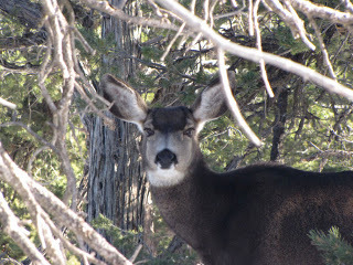 I looked up and saw the most gorgeous mule deer staring back at me. We’d inadvertently taken the same unofficial trail as a large mulie doe and her year-old son who was just barely sporting nubs on his forehead. Being very used to all the people that mill about the canyon, the deer were not the least bit afraid of us, although they did keep their distance as we moved closer to them. They simply wandered a bit further off, but continued their slow grazing on tufts of green that broke through the snow. We enjoyed their company for many long minutes, taking plenty of pictures, then moved off to leave them in peace. It was time again to get out of the cold and back into the warmth of a cozy room.