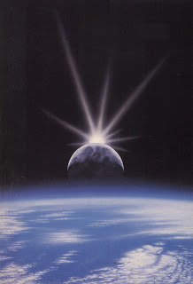 Another piece of artwork that struck me was a painting by Dennis Davidsoncalled Spatium Lux. Diametrically different than Meinrad’s, the space art of Davidson was at once evocative, spectacular and stunning. It had a very different feel than the warm tones of Mother and Daughter, but I liked and considered both. At the same time, my editor suggested Goddess Rising for the title, so I incorporated that into my options.