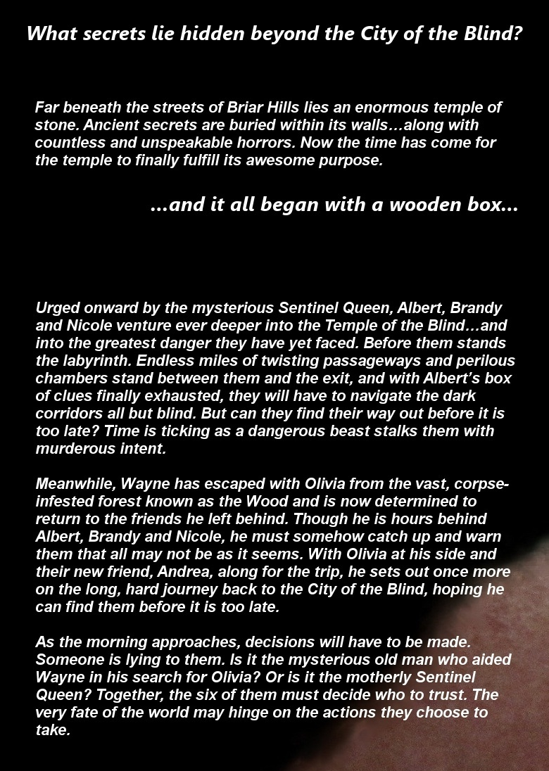 Book 5 of The Temple of the Blind is nearly here! Secret of the Labyrinth picks up where book 3 left off, a short while after Albert, Brandy and Nicole leave the City of the Blind, and it takes place during and after the events of book 4. (So you'll find out what happens next to Wayne, too.) For all my readers here at Dark Things Rising, I have a very special sneak peak of the entire first chapter of Secret of the Labyrinth!