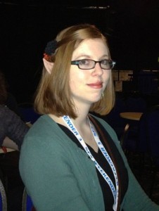 I also found all the cosplaying just a little unnerving, especially the five-foot-tall Dalek who accosted us on our way into the complex on Friday morning, demanding that we open the door for it or be exterminated. Suddenly I was a terrified six-year-old again and just wanted to hide behind the sofa! On the other hand the guy in the Alien costume, who must have been at least eight feet tall in his stilted legs, didn't scare me at all, simply adding to the atmosphere of the con. Not everyone went the whole hog costume-wise; my friend Laura (right) opted for the low-key look, adding a pair of elf-ears to her normal ensemble.