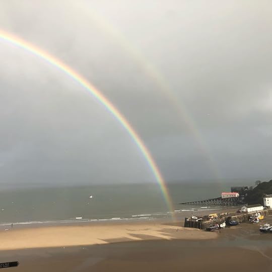 I had a wonderful time in Tenby this week, where the weather was less storm, more showers and double rainbows. This allowed me to stroll along the shore some of the time without being blown away, to explore the fort, and to do some research and scribbling with a wild-mood-swings sea view. As well as launching Celine's Soho Salon anthology by reading some poems at Tenby museum.