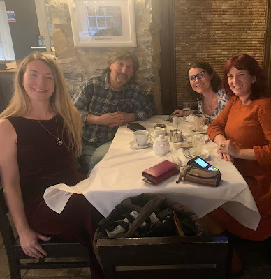 and I received my first festive gift of the year. A lovely time had by all!🎄ID: Zoë and Peter on one side of a restaurant table, Rhian and Susie on the other.