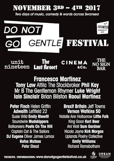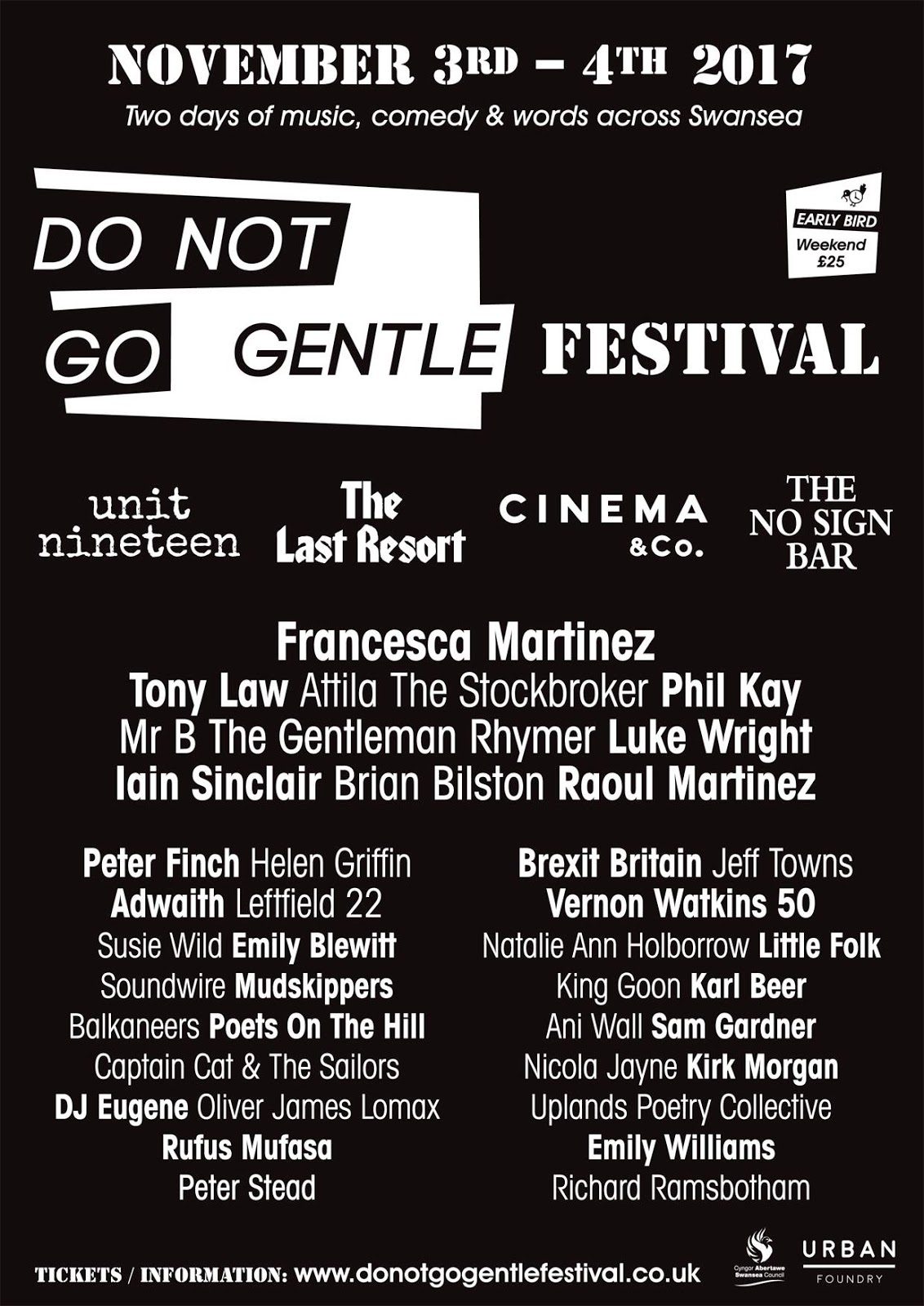 Two weeks today doors open on #DoNotGoGentle2017 A packed program in 4 fab new venues across Swansea Unit Nineteen, The Last Resort, Cinema&Co. No Sign Wine Bar. Tickets available now from www.donotgogentlefestival.co.uk