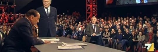 Le battute ad effetto nello studio di Ilaria D'Amico, il fazzoletto per pulire la sedia su cui era seduto Marco Travaglio, le mani incrociate a mimare le manette dell'ex pm Antonio Ingroia. E ancora: il cartello in polisterolo sbattuto più volte sulla testa di Marco Damilano (giornalista dell'Espresso), la lettera col casellario del vicedirettore del Fatto Quotidiano e l'espressione inviperita di Michele Santoro. Silvio Berlusconi entra a gamba tesa nella campagna elettrale per dettare i tempi del dibattito e gli argomenti dell'agenda.