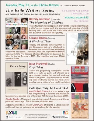 Jesus Hardwell's story collection Easy Living will also be featured, along with Ann Elizabeth Carson and Claudio Gaudio, from Exile Quarterly's 34.3 and 34.4 issues.
