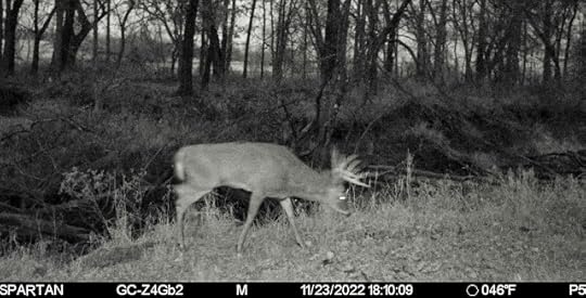 Sometimes the image of an entire deer has been captured, and sometimes only a portion of the deer--the head of a spike buck, an ear, the south end of a doe heading north. Once a photo displayed no deer at all, only a landscape with some brush to the fore, and then we realized that the "brush" were the antler tines of a buck passing close to the camera. That was when we realized we had a good-sized buck that regularly spent time on our land. We became used to seeing images of the buck crossing our bottom land down by the creek. He became our most photographed citizen, with both black-and-white nighttime images and colorful daytime portraits.