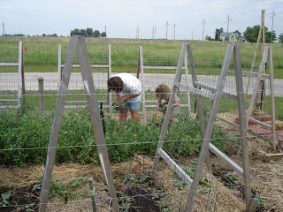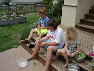 We found our neighbor girls looking for excitement when we arrived home, so we recruited them for pea picking and shelling. They enjoyed themselves immensely--and also found time for trips to the strawberry and raspberry beds.