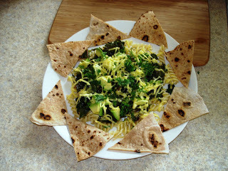 spiral noodlessteamed kale fresh from the garden w/ pumpkin seeds and raisins olive oil w/ herbes de Provenceavocadograted jack cheese (from Radiance Dairy)garnish of chopped cilantro fresh from the gardenlightly saltedslices of fresh chappatiEverything was organic and yummy! Wonderfully fresh vegetables--walk to the garden, cut the vegetables, then cook.