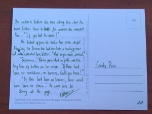 A while back I got some touristy-type postcards of Cape Town and offered to write people drabbles. All they needed to do was send me a When the Sea is Rising Red prompt (the things I do on twitter when I’m avoiding work…:D).