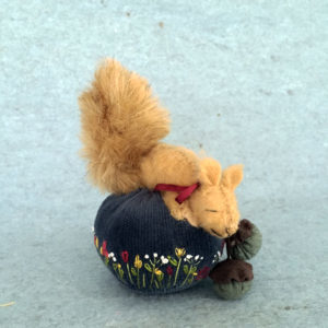 The little squirrel is 3-1/2″ long an his snoozing spot is 2-1/2″ high and 9″ in circumference.