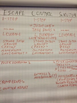 The third list was recent: Escape, Control, Disable. It's a way to organize everything you teach, a way to decide what is relevant and what isn't. Strategies, mindset and appropriate techniques are very different for these three different fields.