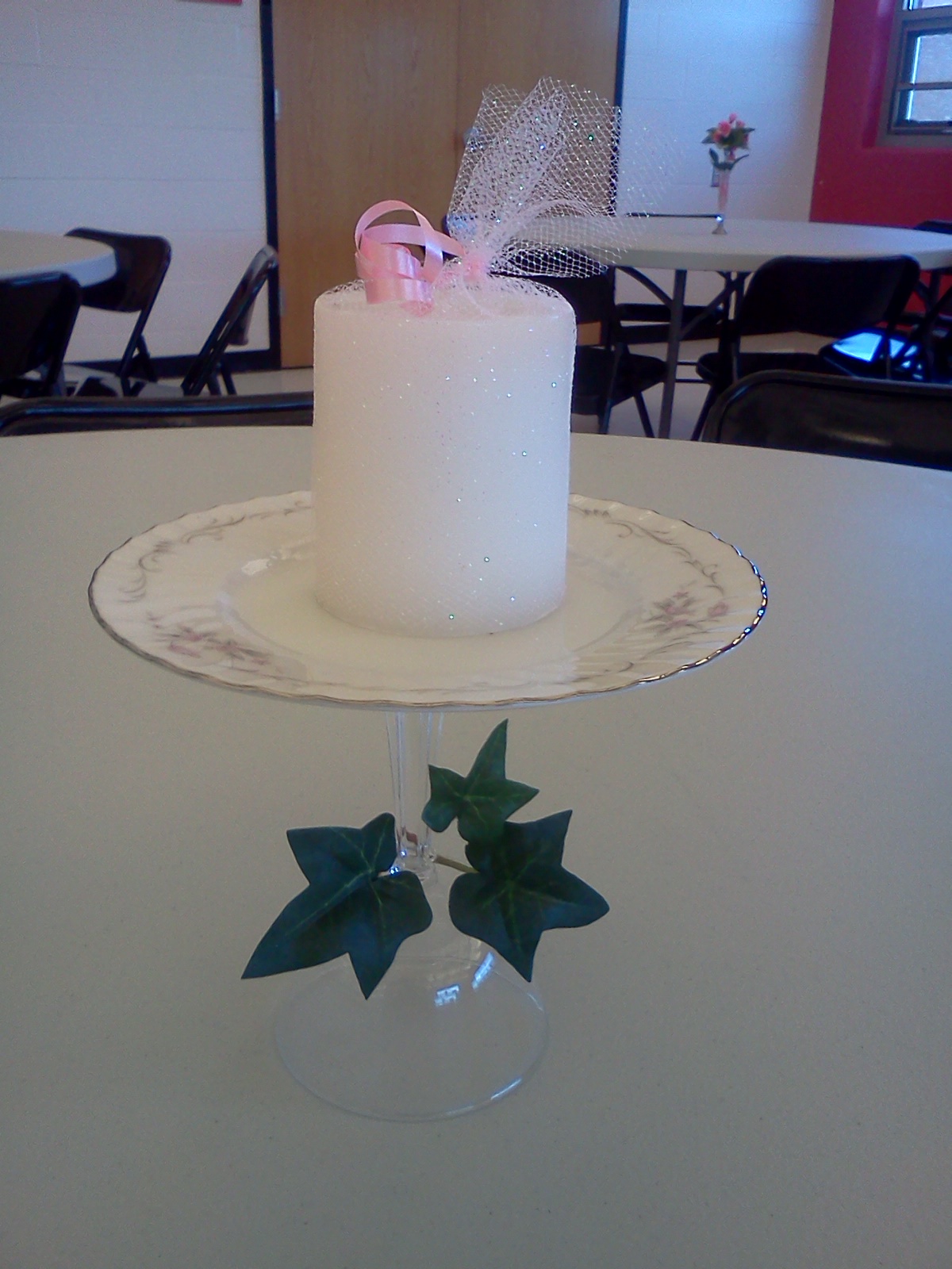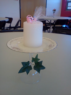 I also made some candle centerpieces from thirty cent plates and goblets I purchased at the thrift store and glued together with my handy dandy E6000 craft glue. That, along with a little left over ivy from a previous project, a little curling ribbon, some Dollar Tree candles, and some clearance netting from Wal-mart rounded out the project. Wouldn't these be adorable for a wedding?
