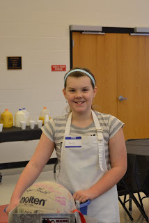 Recess duty on Friday at MCS was interesting since a two hour delay caused it to be held on the very small music room, the only room available at the time. Try to imagine fifth grade boys jump roping, fifth grade girls hoola hooping, and another set of fifth grade boys throwing a ball as they played Monkey in the Middle next to a group of children laying on the floor playing checkers. Needless to say I had to move once or twice to keep from being trampled or pummeled and I could have used a pair of earplugs as well, but I survived and was able to decorate a table as requested with a basket centerpiece reflecting the farm market that I manage in the summer.