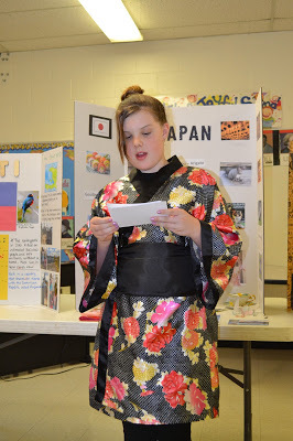 She gathered facts, found pictures for her display board, and retrieved all her Japanese memorabilia from various parts of the house. I took it upon myself to create a costume from thrift store items. I scoured the second-hand shops until I found a silky robe that looked oriental in pattern, but it had a very narrow belt that just wouldn't do because traditional kimonos are worn with an obie (a wide silk sash). I kept searching until I finally found a single, silky, black curtain. It was two panels with an attached valance, and I knew if I cut off one of the floor length panels I could whip it into a obie of sorts on my handy dandy sewing machine. Although not exactly authentic, most of the audience loved Emily's make-shift robe and actually thought it was the real deal. Resplendent in costume finished off with Japanese toe socks and flip flops, Emily gave a great presentation.