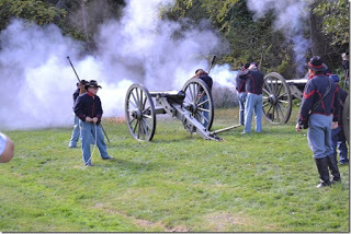 Civil War Soldiers firing the cannons. A log cabin and the Big House where Charles Bromfield lived.