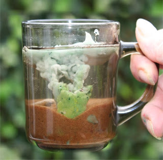 Since Emily and I were studying volcanoes and earthquakes for school this past week, I thought it would be fun to do a science experiment. The idea was to make a little volcano in a glass container. Wax, placed in the bottom of the container, covered with sand and water, and heated, was supposed to produce simulated molten that would shoot up through the sand due to pressure created by the heat. The picture below shows what it should look like if successful.