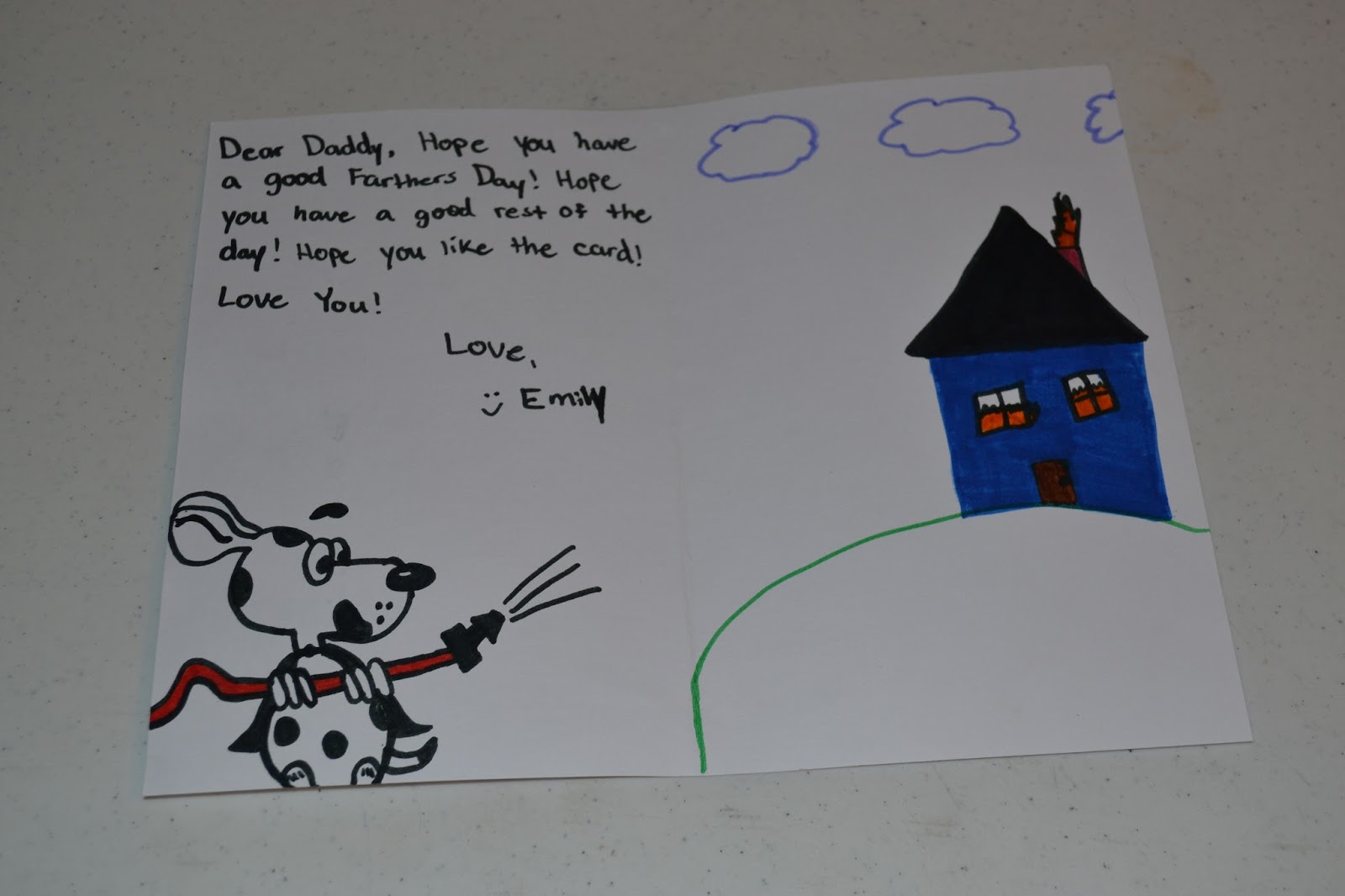 Emily loves to draw and always practices whatever character Jeff has shown. She even included her version of the Dalmatian putting out a fire in the Father's Day card she made for her dad.