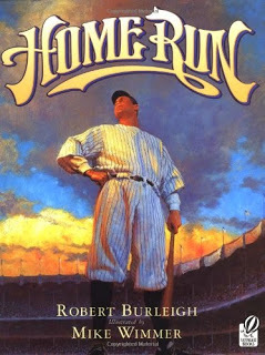 Home Run by Robert Burleigh and Mike Wimmer is the story of Babe Ruth. Robert told Babe's amazing story in a non rhyming poetic manner as if he were describing a single baseball game. In addition, every other page included facts on vintage style baseball cards. Mike added dimension to the story with some of the most fantastic illustrations I have seen in a while. Illustrations, which I might add, that looked like they were oil paintings.