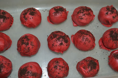 For Cook-book Club Emily prepared Oreo Truffles. Since she didn't decide what she was making until late the night before, she had to use vanilla flavored melting discs instead of chocolate because I just wasn't going to the store at that hour, and I had some leftover red discs.