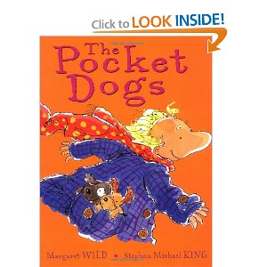 The Pocket Dogs by Margaret Wild. The pocket dogs, Biff and Buff, are small and ride in Mr. Pockets coat pockets. One day Biff falls out of a hole in Mr. Pockets Pocket and he finds out that he does not like to be a basket dog, a baby carriage dog, or a shopping cart dog. And just when things seem at there worst and Biff feels most fearful, Mr Pockets and Buff find and rescue him.