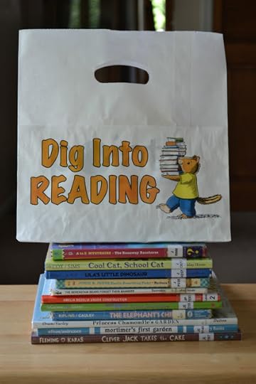Today was the first day to sign up for summer reading at our local library, so Emily and I hopped on over. Actually we drove since the library is all the way on the other side of town, but we arrived just the same. We filled out our registration forms, we filled out our picture consent forms, and we received our library goodie bag replete with a pencil,  a book mark, the summer agenda.
