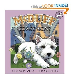 McDuff Comes Home by Rosemary Wells. McDuff chases a rabbit in the garden next door and before he knows it he is lost. A kind lady finds him and helps him find his way home where his favorite treat, vanilla rice pudding and yummy sausages, awaits.