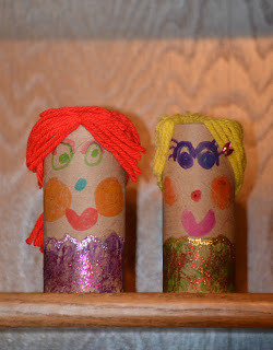 Since my daughter, Emily, was very small, we have been making crafts. Crafts are so much a part of our life that whenever she has a play date she expects me to have a craft ready for her and her friend. So it didn't surprise me at all that while on Spring break this week she came up with a craft of her own. She managed to save some toilet  paper rolls, scavenged out craft drawers, and created these cute t.p. girls.