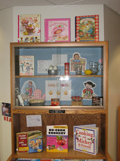 Today I switched out the children's display case at my local library. I took out the beach theme that went along with this year's summer reading program and replaced it with a cooking theme. I started setting up the children's displays last September when I heard the children's librarian was looking for things to display. It was a Barbie theme with dolls and accessories graciously lent to me by my daughter. I divided the two shelves into four sections and set up little Barbie scenes. One area was a driving to the beach scene with a Barbie Jeep and lots of road signs. Barbie let Ken drive of course because she didn't want to hurt his manly feelings. Another area depicted a teenager babysitting Kelly and a friend. The teen was at a table doing homework and the kids sat on a couch watching television. The the other two sections were a mix of Barbie DVDs also borrowed from my darling daughter and variously dressed Barbies. And of course, Barbie books from the libraries shelves were prominently displayed on top of the small, oak case. To me it was a thing of beauty and an outlet for my creative soul. I was told record numbers of Barbie books were checked out that month.
